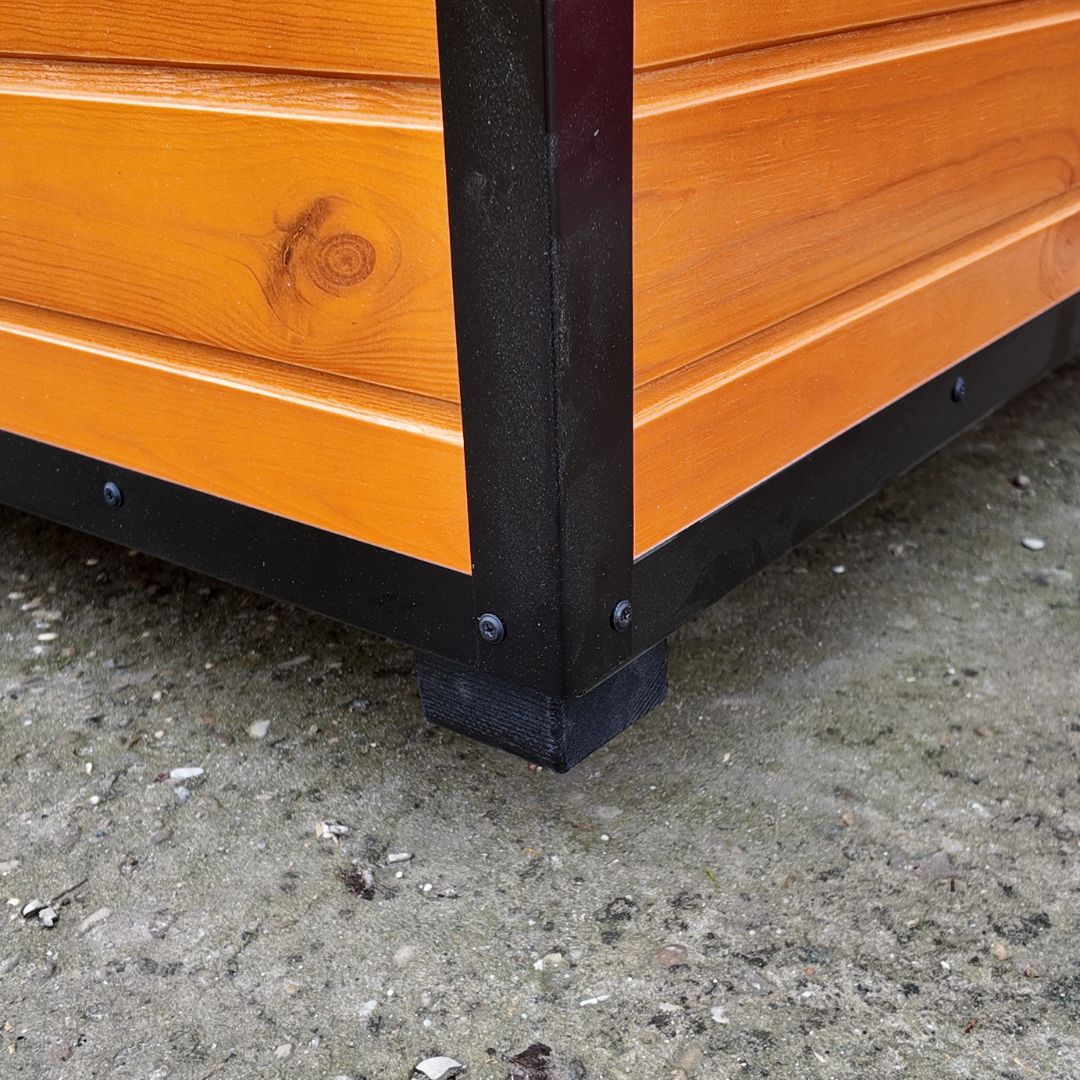 Finisajul ambelor custi este cel standard, culoare teak si sindrila rosie tip solzi pe acoperis. Ambele custi au profil metalic la intrare. Una este dotata cu mocheta si profil antiros la baza custii iar cea de a doua cu folie PVC la intrare.