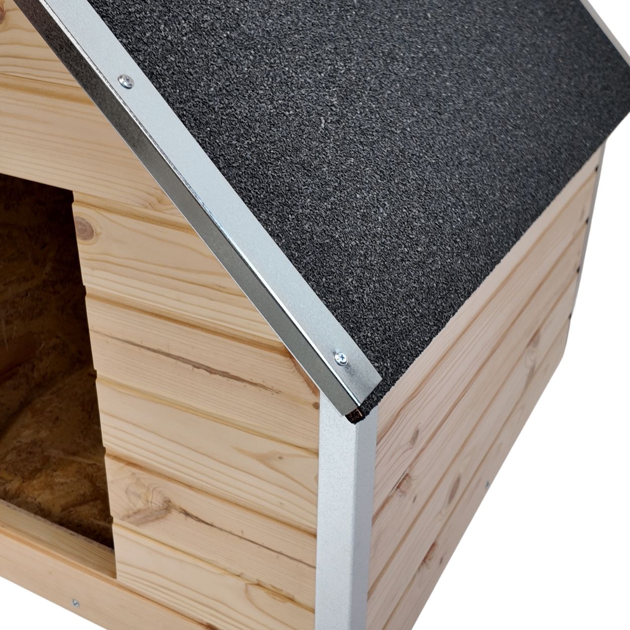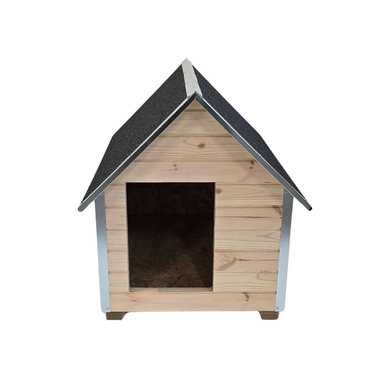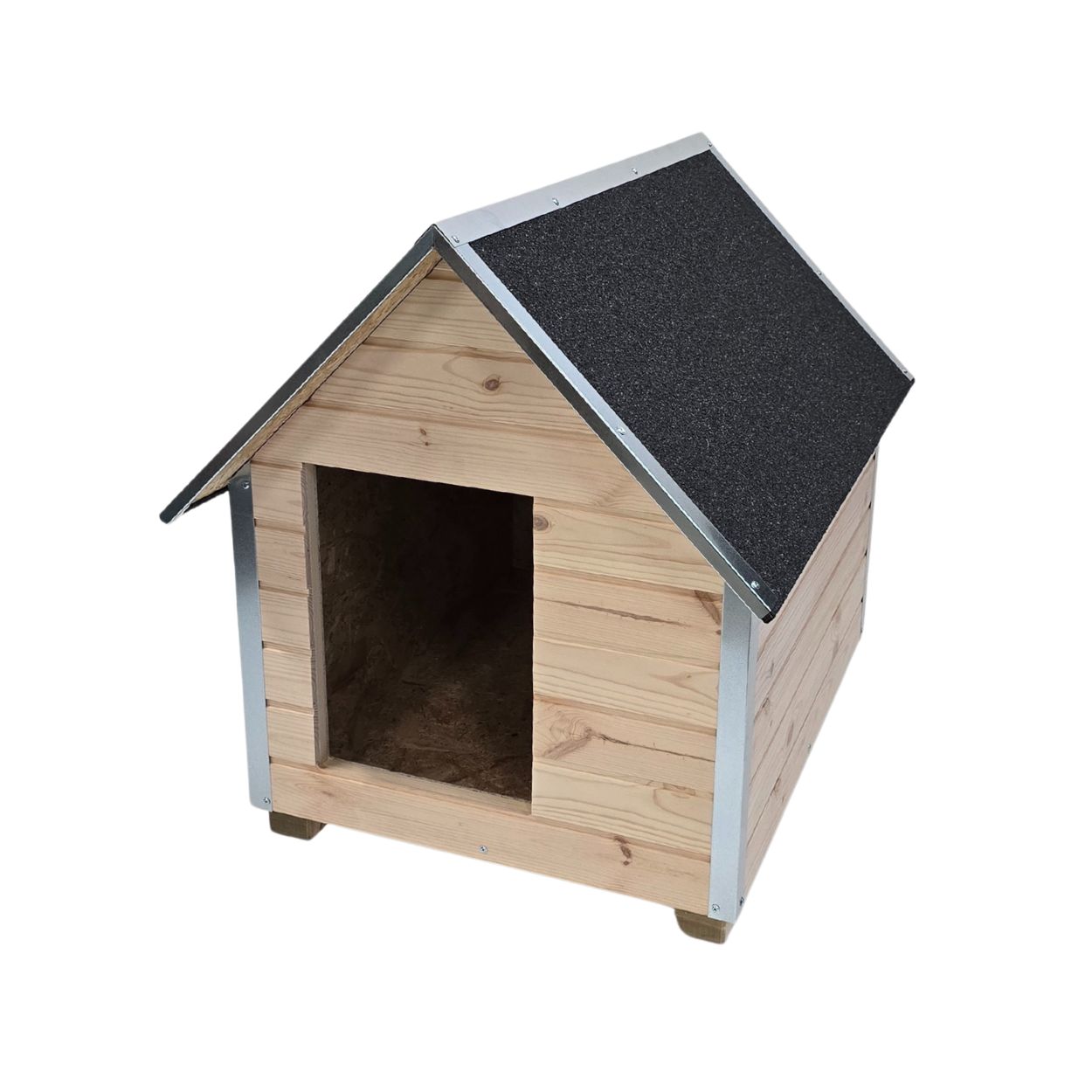Cuscă câine mărime medie, cu protecții metalice anti-ros, podea și pereți de 4 cm izolați termic, natur, acoperiș în două ape, perfectă pentru toate anotimpurile, fabricată în România de peste 15 ani
