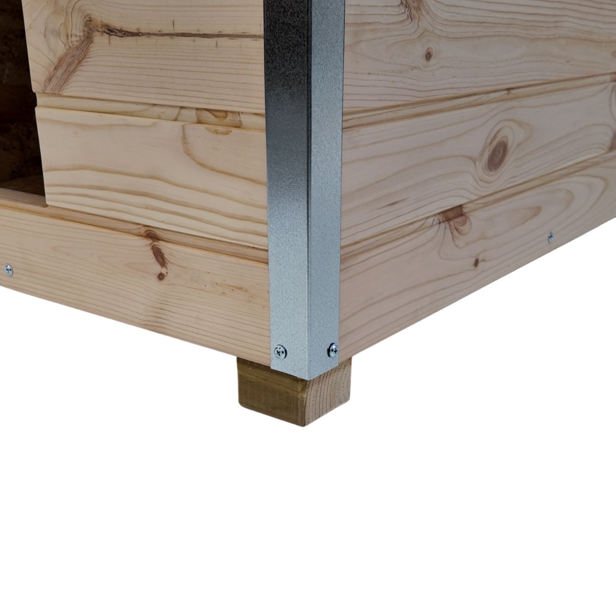 - Înălțată de la sol cu picioare de 5 cm foarte solide, fabricate din lemn tratat în autoclavă, cu o rezistență de 20 de ani, ce feresc câinele de umezeală și menține cusca uscată;