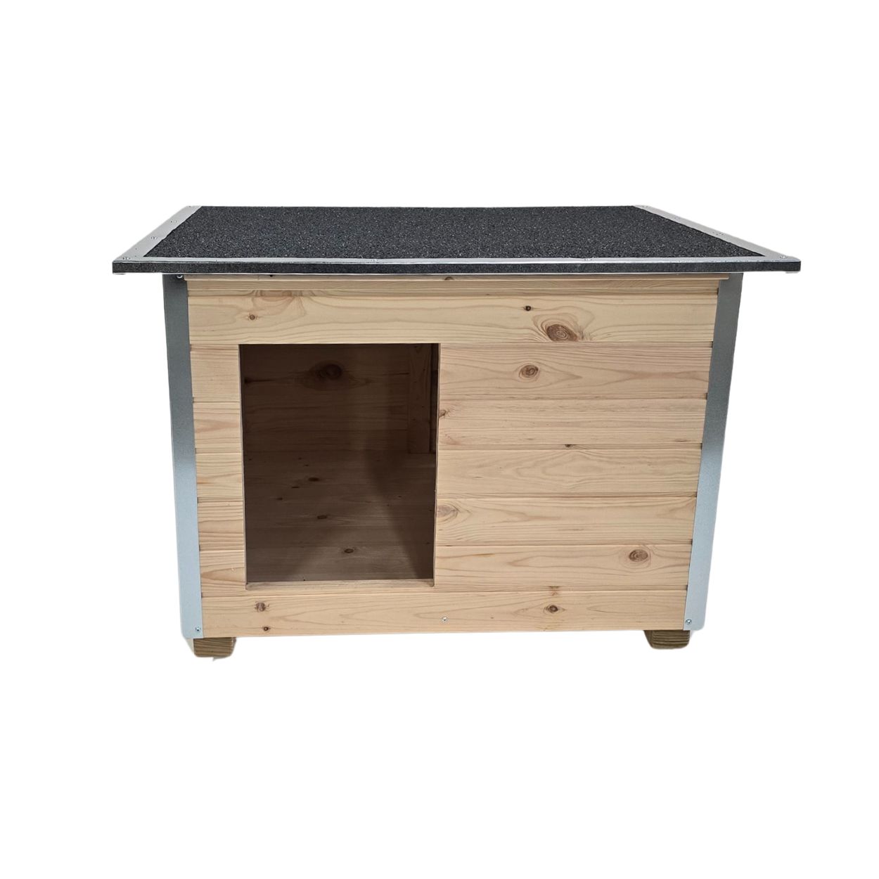 - Înălțată de la sol cu picioare de 5 cm foarte solide, fabricate din lemn tratat în autoclavă, cu o rezistență de 20 de ani, ce feresc câinele de umezeala solului;
