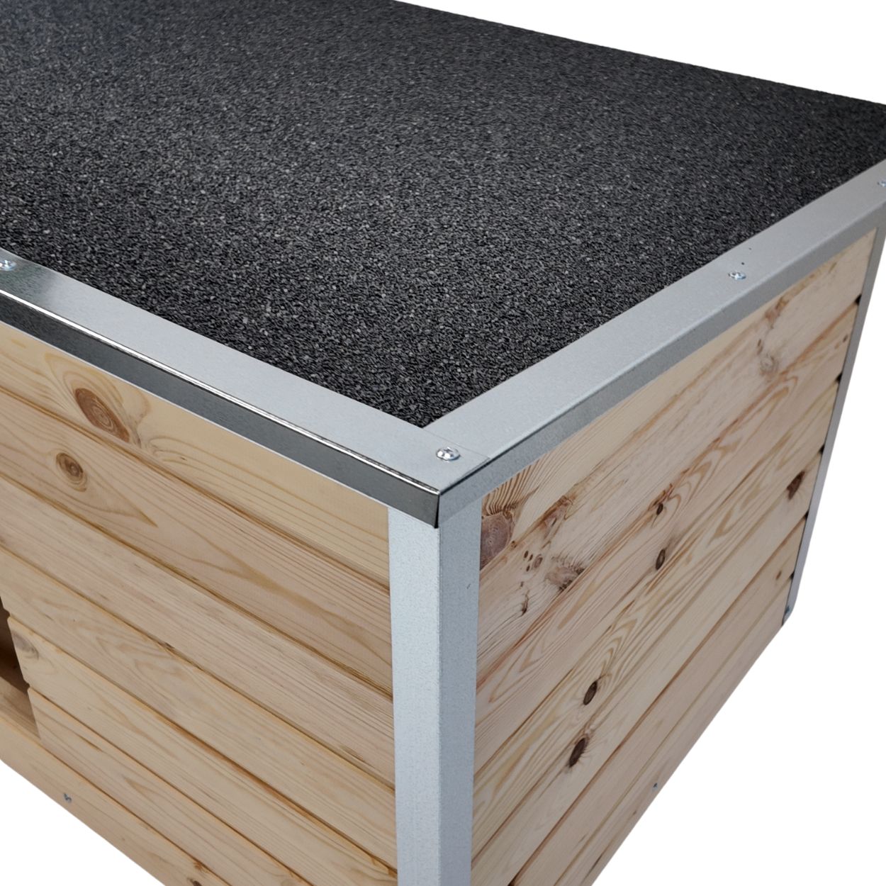 - Acoperiș rabatabil al custii învelit cu carton bituminos de culoare neagră, ceea ce îi crește și mai mult rezistența la condițiile exterioare dificile fiind același material ce se montează și apecoperișurile caselor și facilitează accesul în interior pentru curățenie;