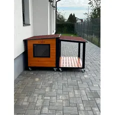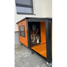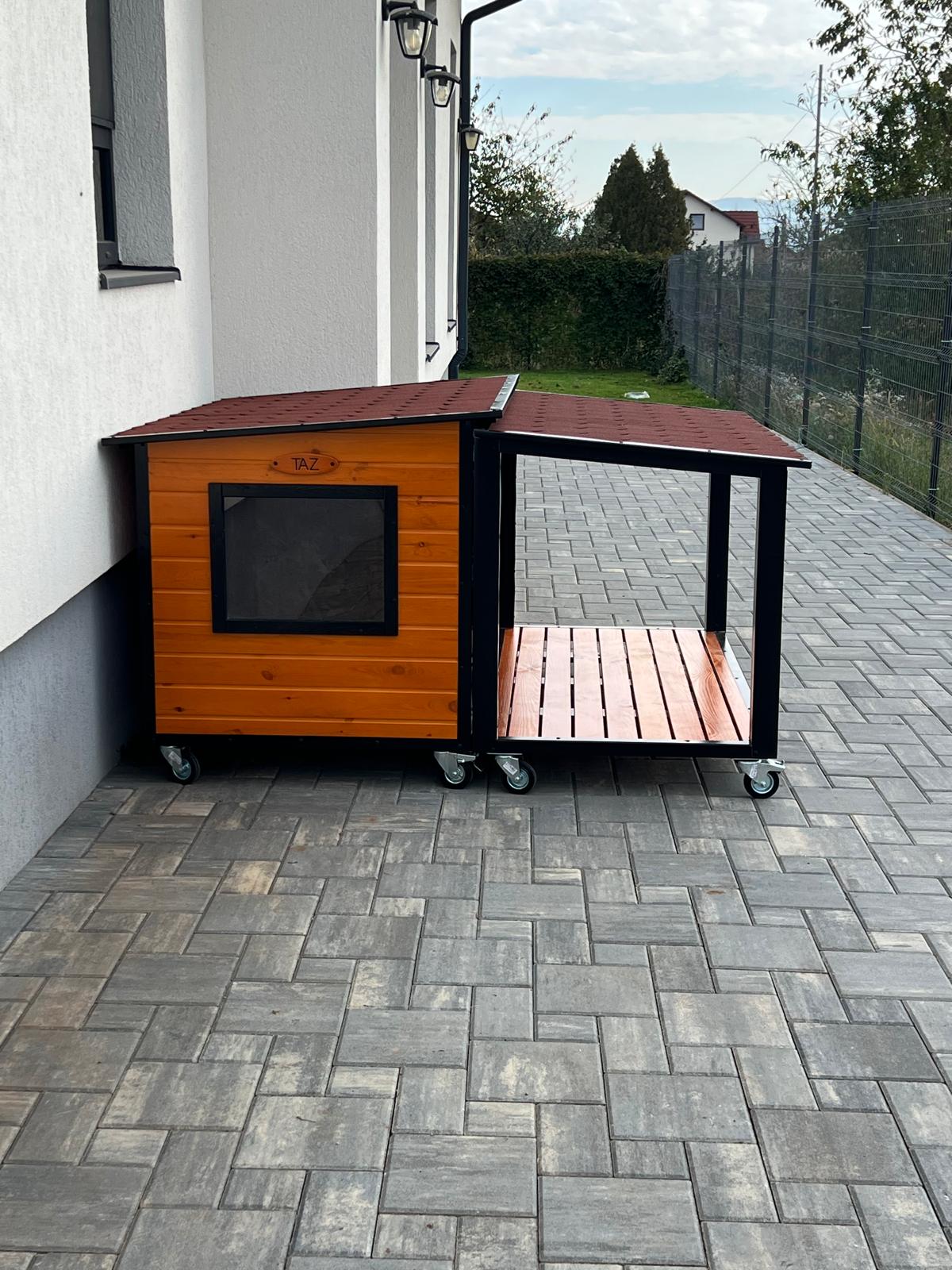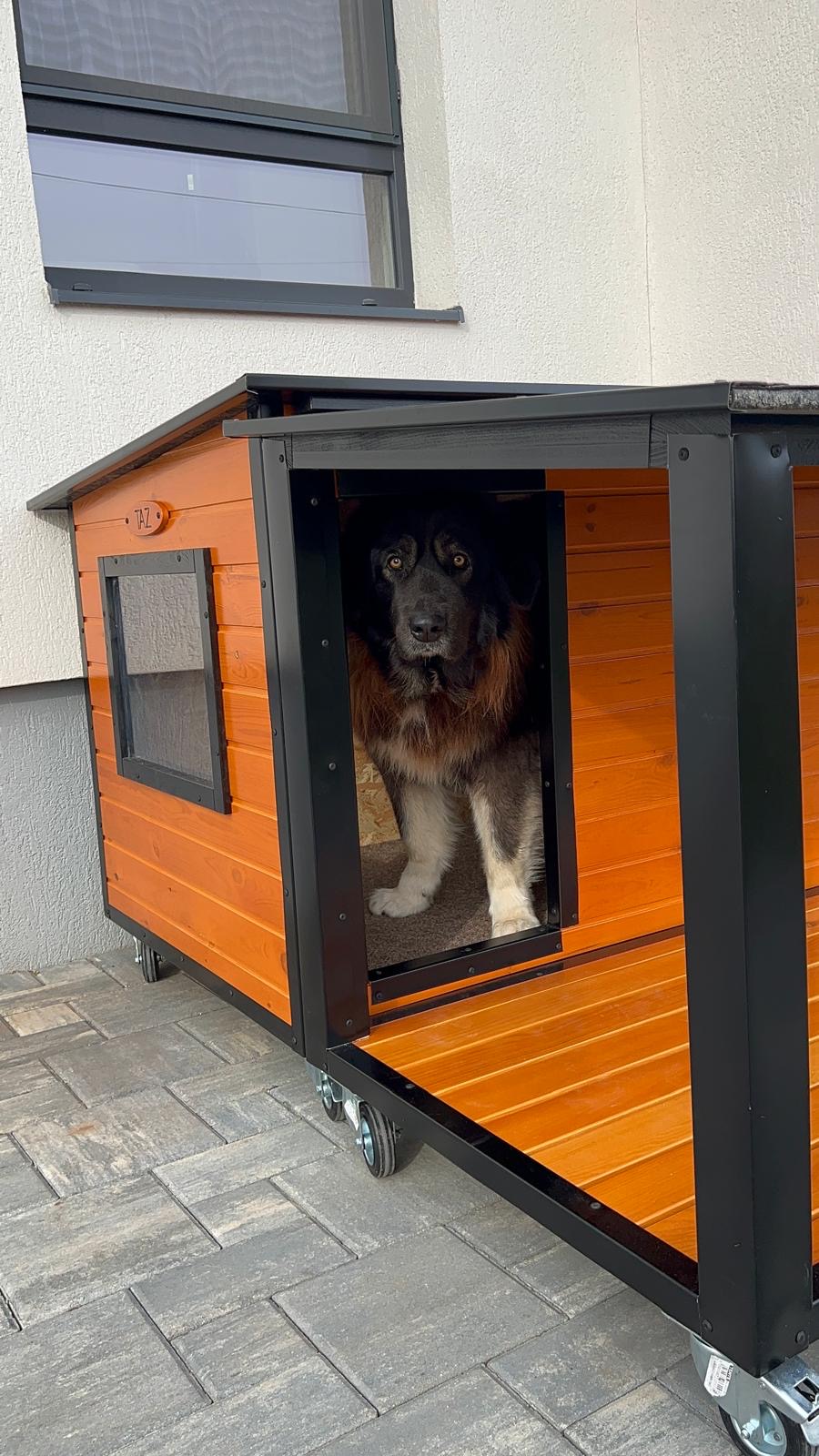 Cuscă câine mărime extra mare cu două camere, cu protecții metalice anti-ros, podea și pereți de 4 cm izolați termic, realizată din lambriu lăcuit cu acoperiș rabatabil, perfectă pentru toate anotimpurile, fabricată în România de peste 15 ani și livrată asamblată oriunde în țară.