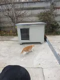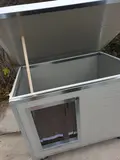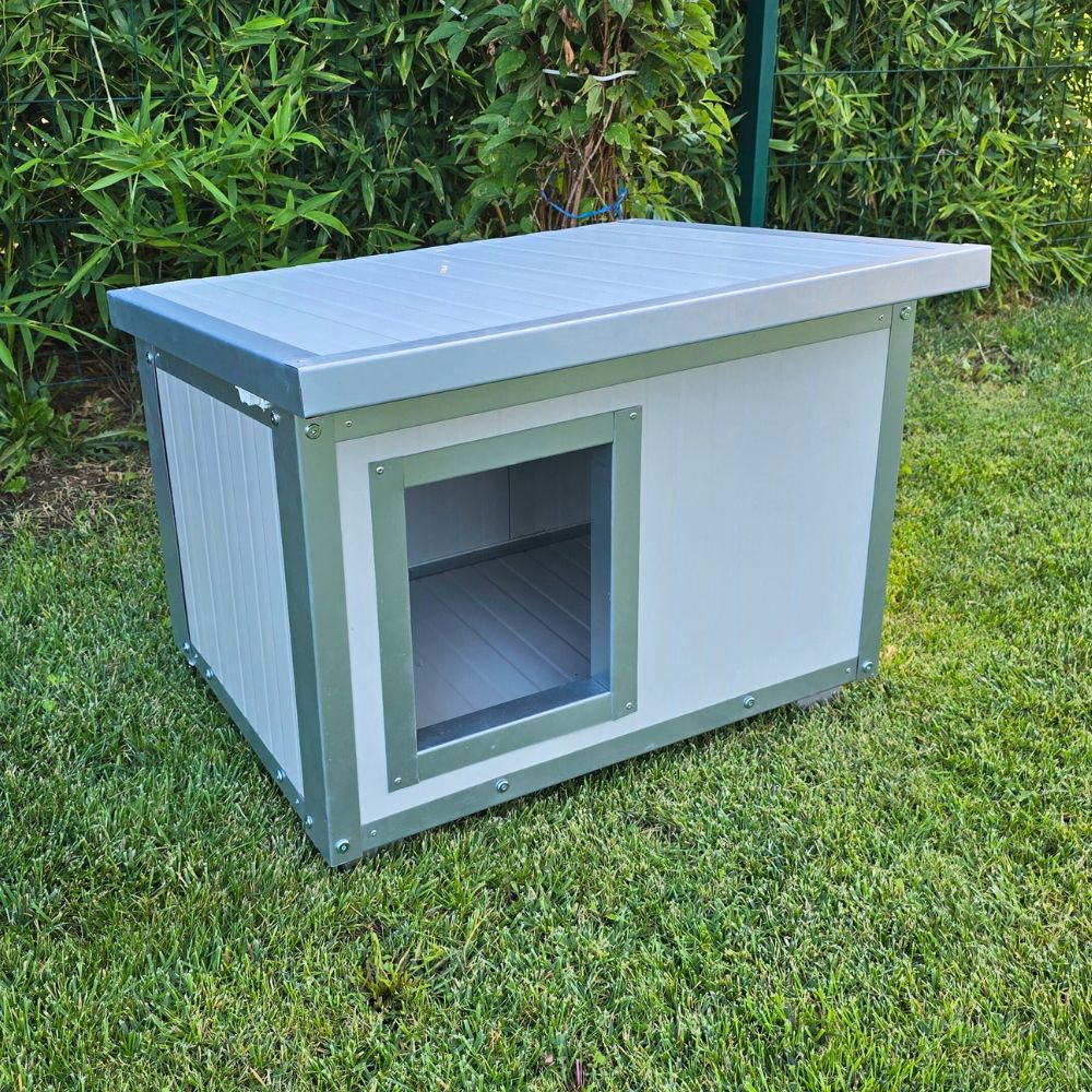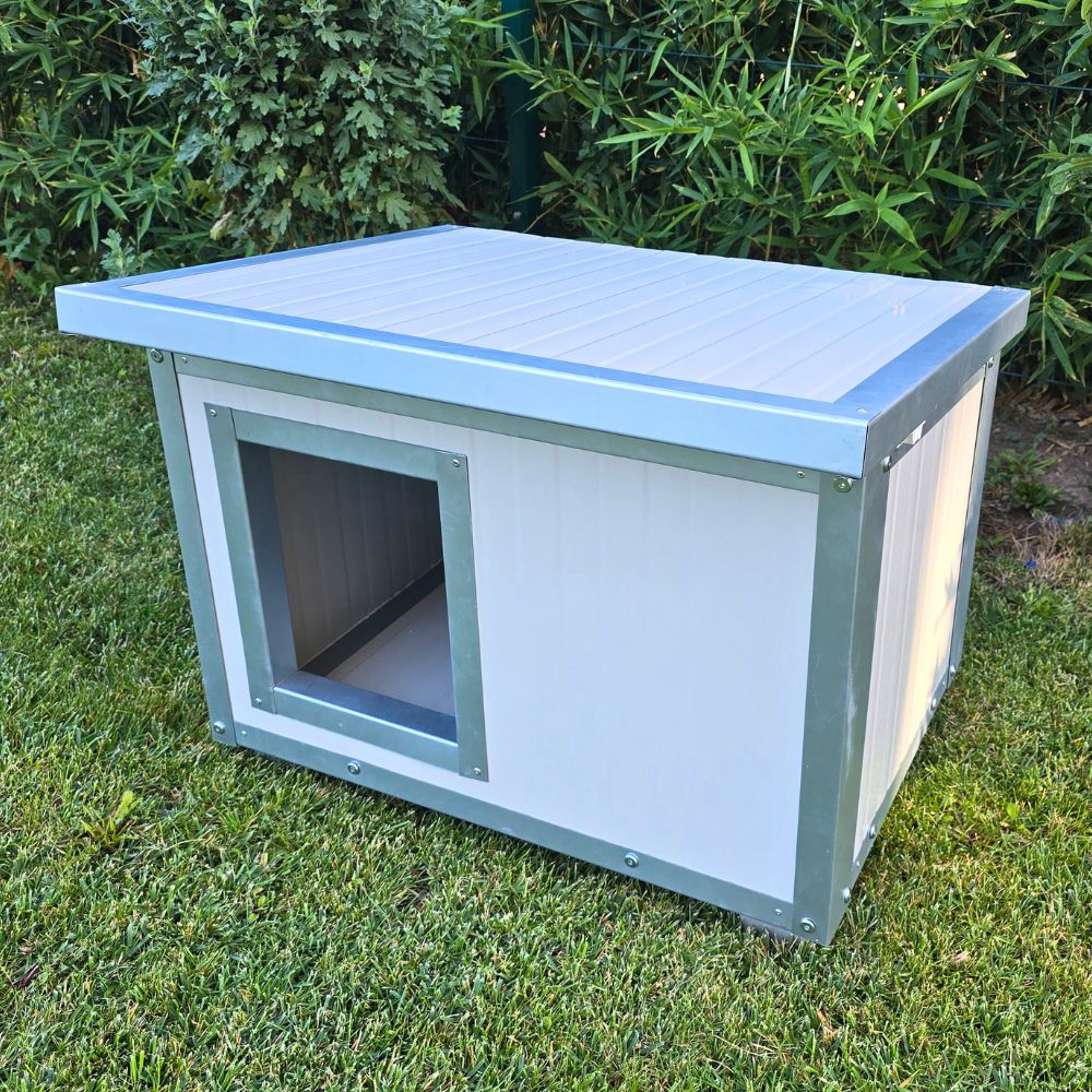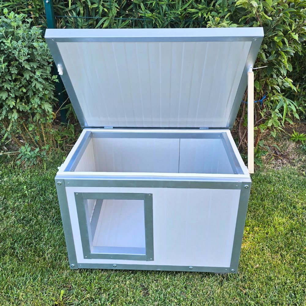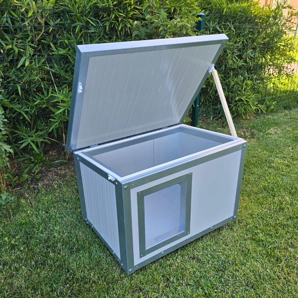 Cușcă câine mărime extra mare, fabricată din panouri metalice termoizolate, cu acoperiș rabatabil, extrem de rezistentă și ușor de curățat.