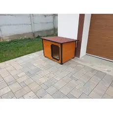 Cuscă câine mărime mare, cu protecții metalice anti-ros, podea și pereți de 4 cm izolați termic, realizată din lambriu lăcuit cu acoperiș rabatabil, perfectă pentru toate anotimpurile, fabricată în România de peste 15 ani și livrată asamblată oriunde în țară.